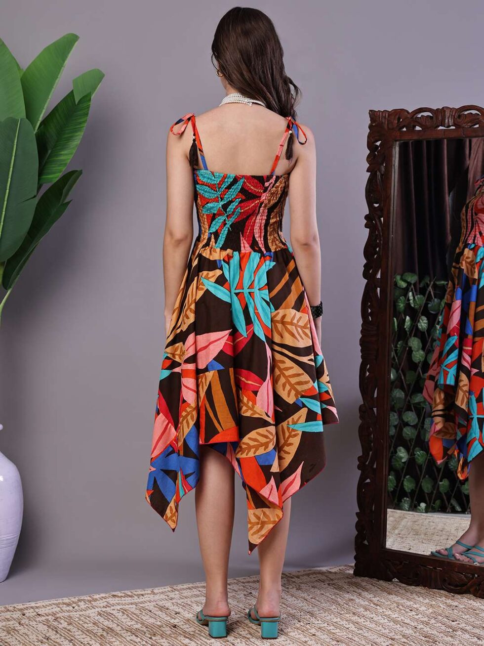 Effortlessly stylish dress with a vibrant abstract print, tie-up shoulder straps, and a chic high-low handkerchief hemline ? perfect for casual days or evening gatherings.